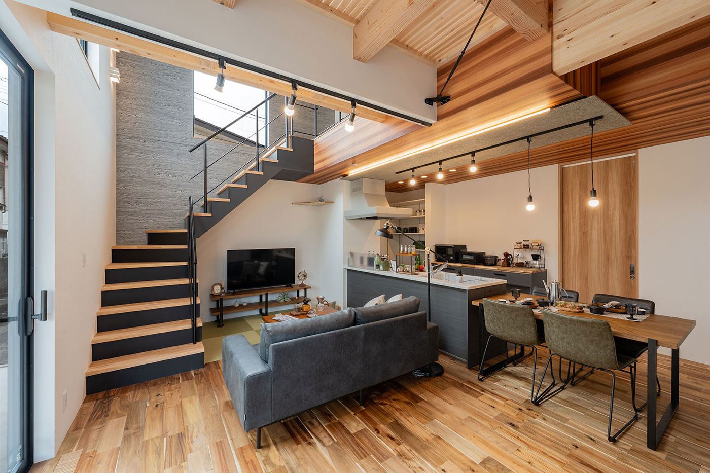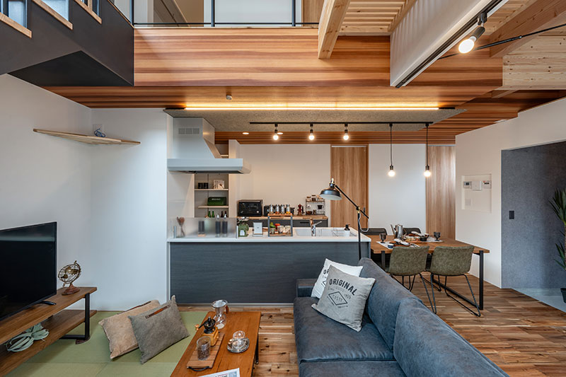 大きな窓のあるリビングに吹抜け(キャットウォーク付き)と天井スノコ床との繋がりで大空間の印象的なLDK+畳スペース。抜け感のあるリビング階段もあって空間の広がりを最大限に魅せています。
