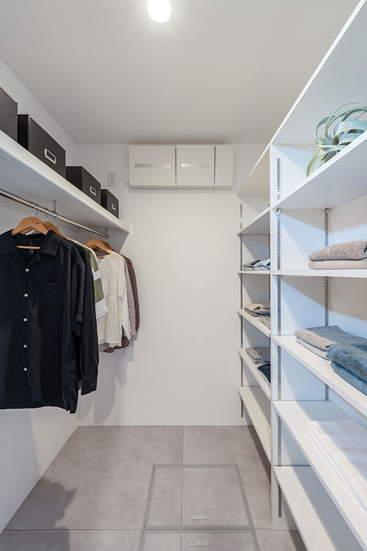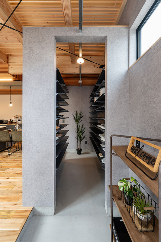 玄関を入ると大容量のシューズクロークへ。動線を二つに分けることで、来客時にも靴や汚れ物をサッと片付けることができ、プライベートに配慮した動線になっています。沢山の棚のある土間床のシューズインクローク。