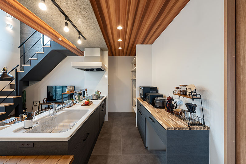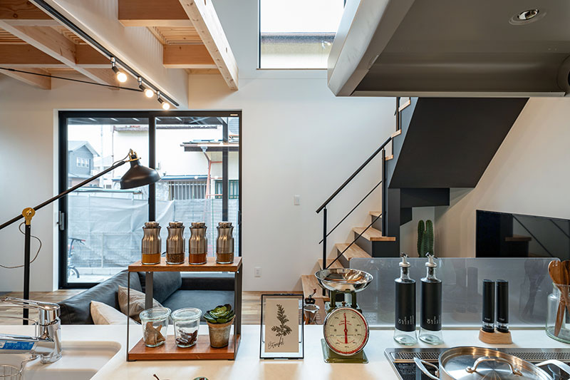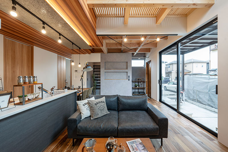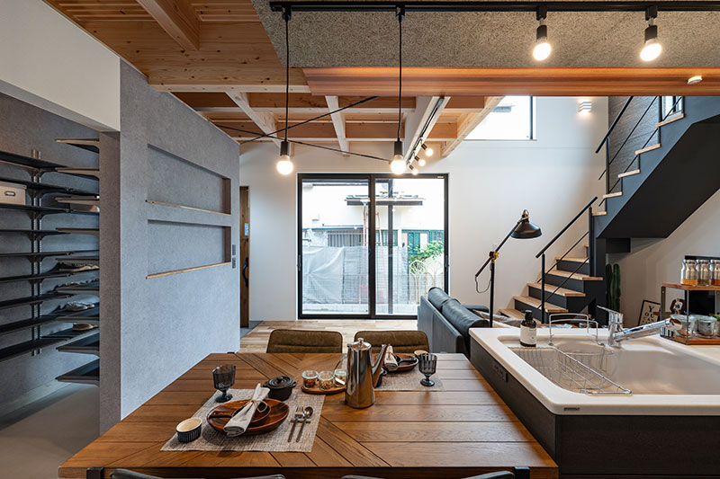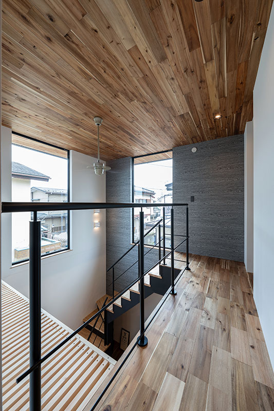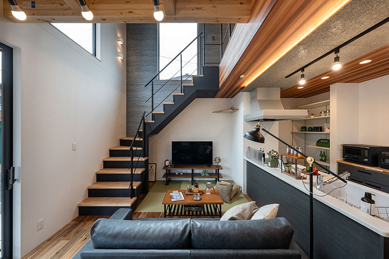 木の温もりとブラックアイアンを組み合わせた、開放感あふれるLDK。吹き抜けとオープン階段が視線を伸ばし、上質で心地よい暮らしを演出します。一部天井をスノコにすることで、2階の部屋の日差しが1階まで差し込み、空調効率も良くなります。なお、格子部分は吹抜けという扱いになり、建築面積に含まれないという隠れた利点もあります。