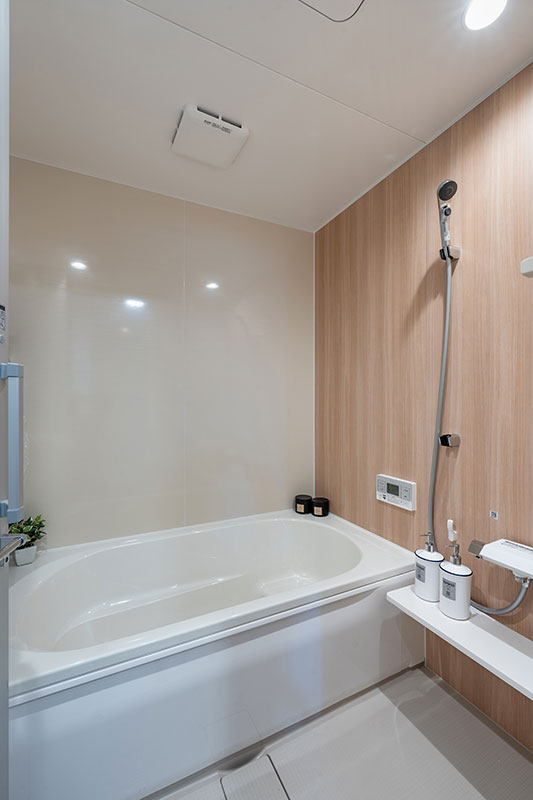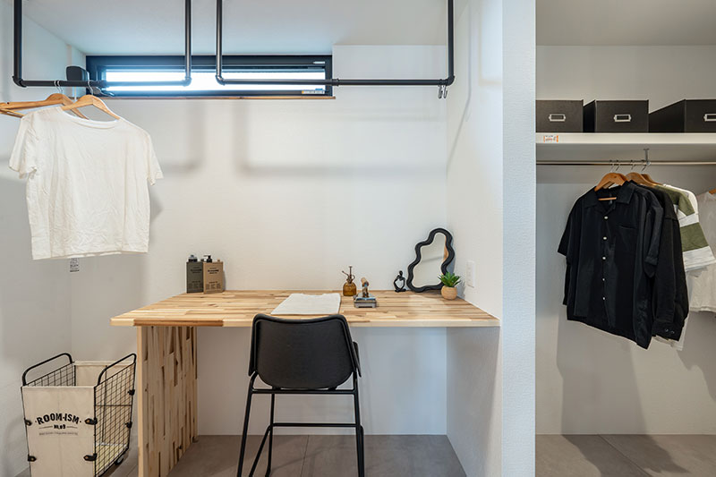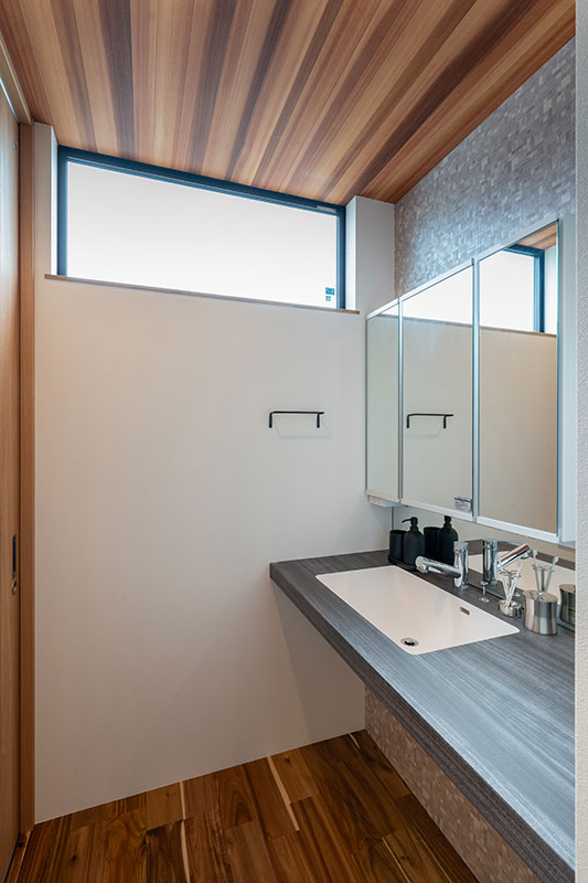 洗面・浴室などの水廻りとランドリールーム、クローゼットを一体化し、家事動線を最短に設計しました。キッチンに隣接したゆとりある脱衣ランドリー室には室内干しスペースとお片付けカウンターを設け、効率よく家事が完結します。隣接するファミリークロークへもスムーズにアクセスできる、機能的なプランです。朝の身支度が心地よい、明るく広々とした洗面カウンターとトイレは、施主様こだわりの内装で仕上げました。