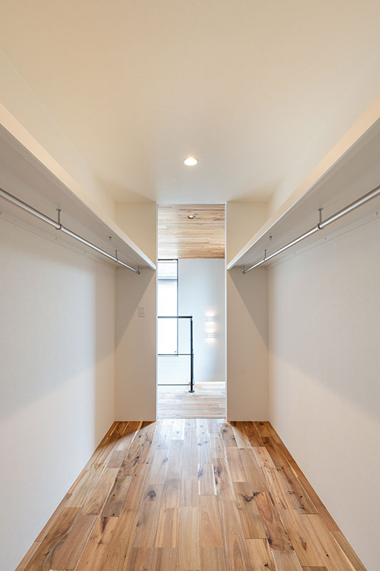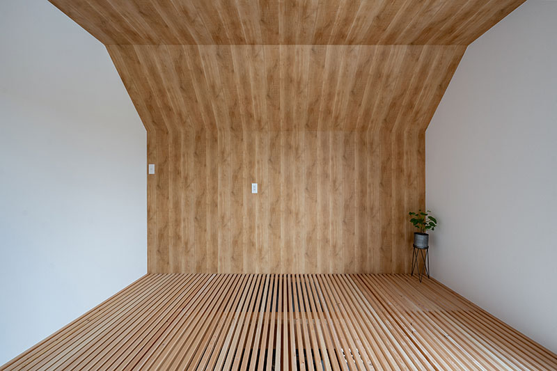 主寝室はスノコ床と木目で包み込むような壁・天井仕上げとし、落ち着きのある“こもり感”を大切にした空間に仕上げました。足触りのよいスノコ床がやわらかな抜け感を生み、木の表情が天井から壁へと連続することで、洞窟のような安心感と上質さを演出。静かに心と身体を休められるプライベート空間となっています。
