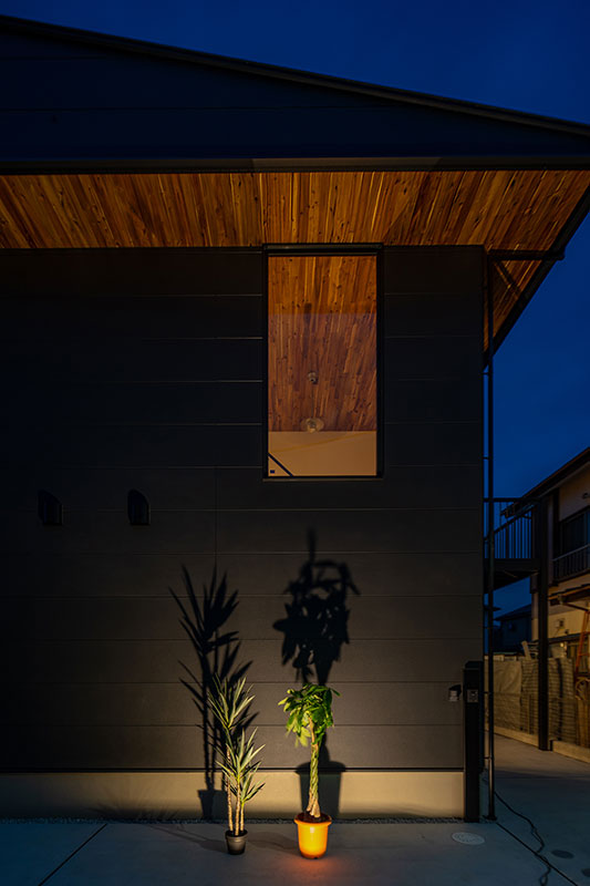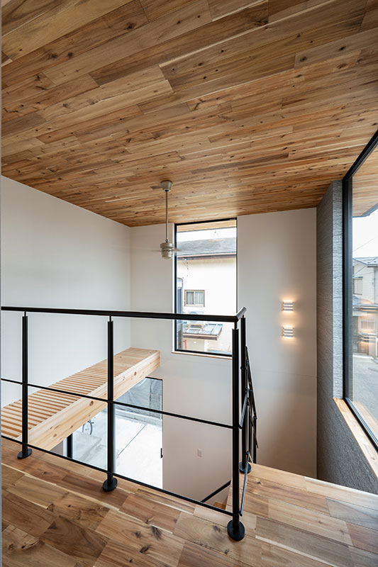 リビング上部の吹抜けには大きな窓があり、明るい陽射しがLDKに優しく差し込みます。室内天井と外部軒天に同材の無垢板張ることで、建物の外へまで空間の繋がりと広がりを感じる仕掛けになっています。