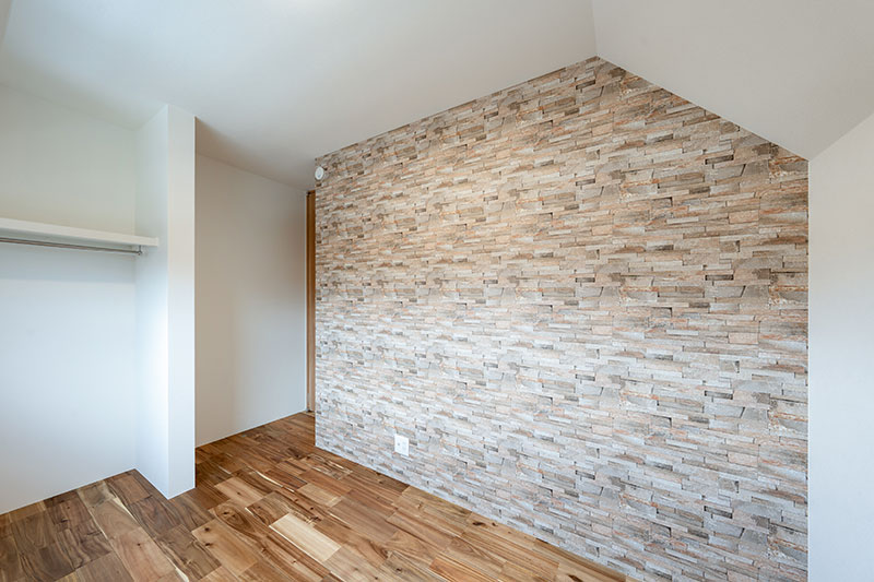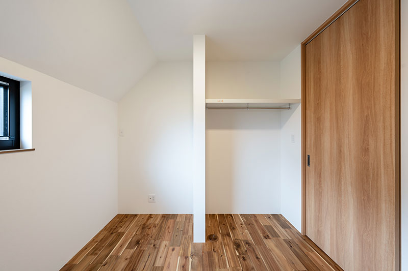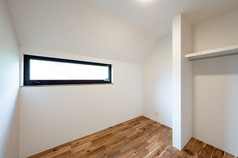 勾配天井のある屋根裏部屋のような子供用の2部屋は、ベッド・デスク・クロークがすっきりと納まる広さで、コンパクトながらも使いやすくまとめました。アクセントウォールや横長の窓から差し込むやわらかな光が、シンプルな中にも個性を感じさせる心地よいプライベート空間に仕上がっています。
