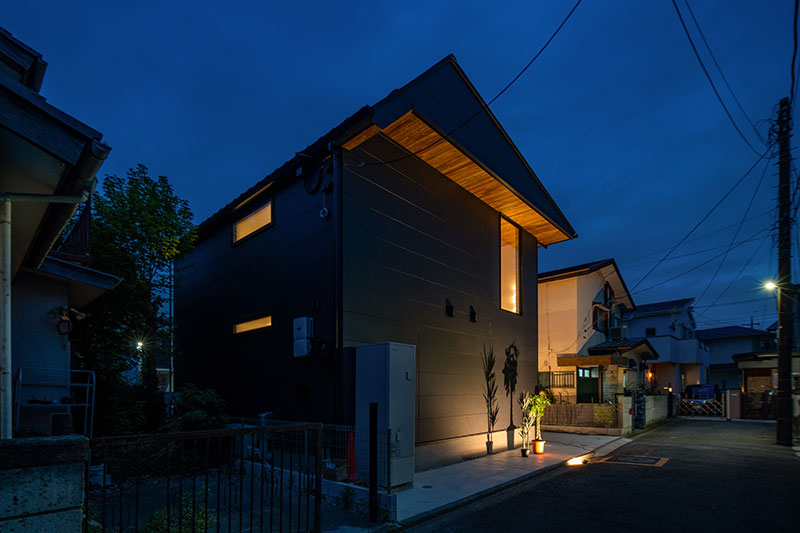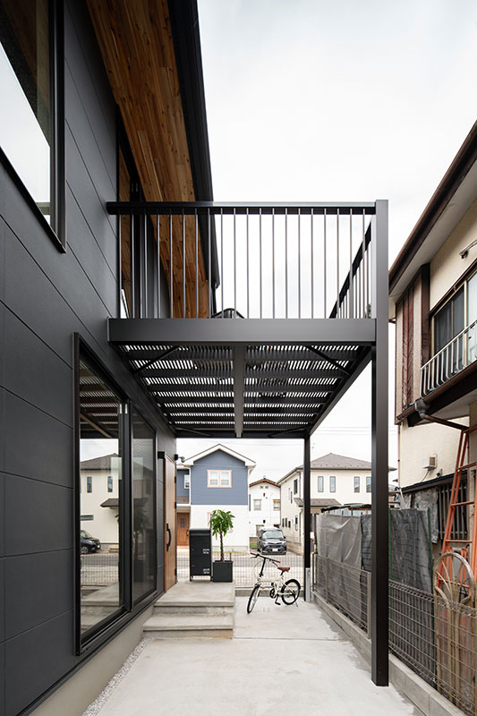 ブラックと木目のコントラストでスタイリッシュに仕上げた外観。玄関上部には光をとおすバルコニーがあり、雨除けも兼ねています。
